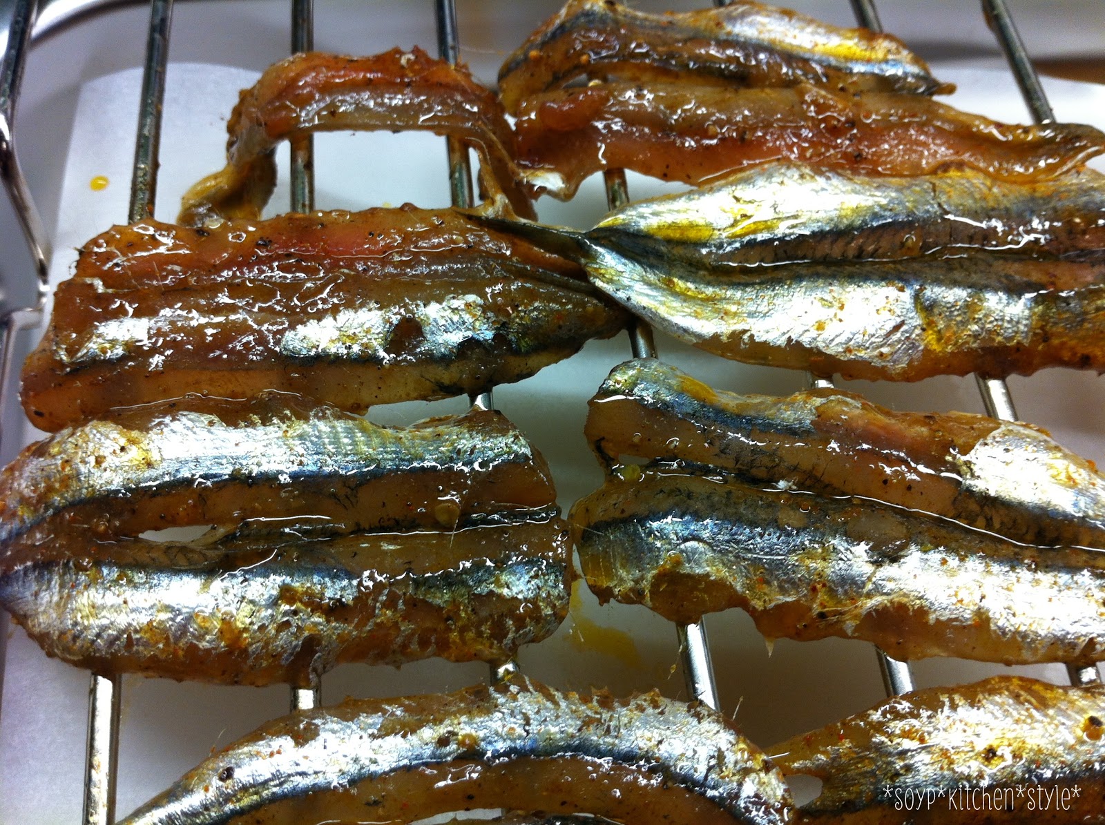 Die Sardellen wurden enthauptet, ausgenommen und in Olivenöl mit Baharat gewälzt, auf dem Grillrost ausgebreitet und bei 200° ca. 20 Minuten gebacken, bis sie schön knusprig sind.