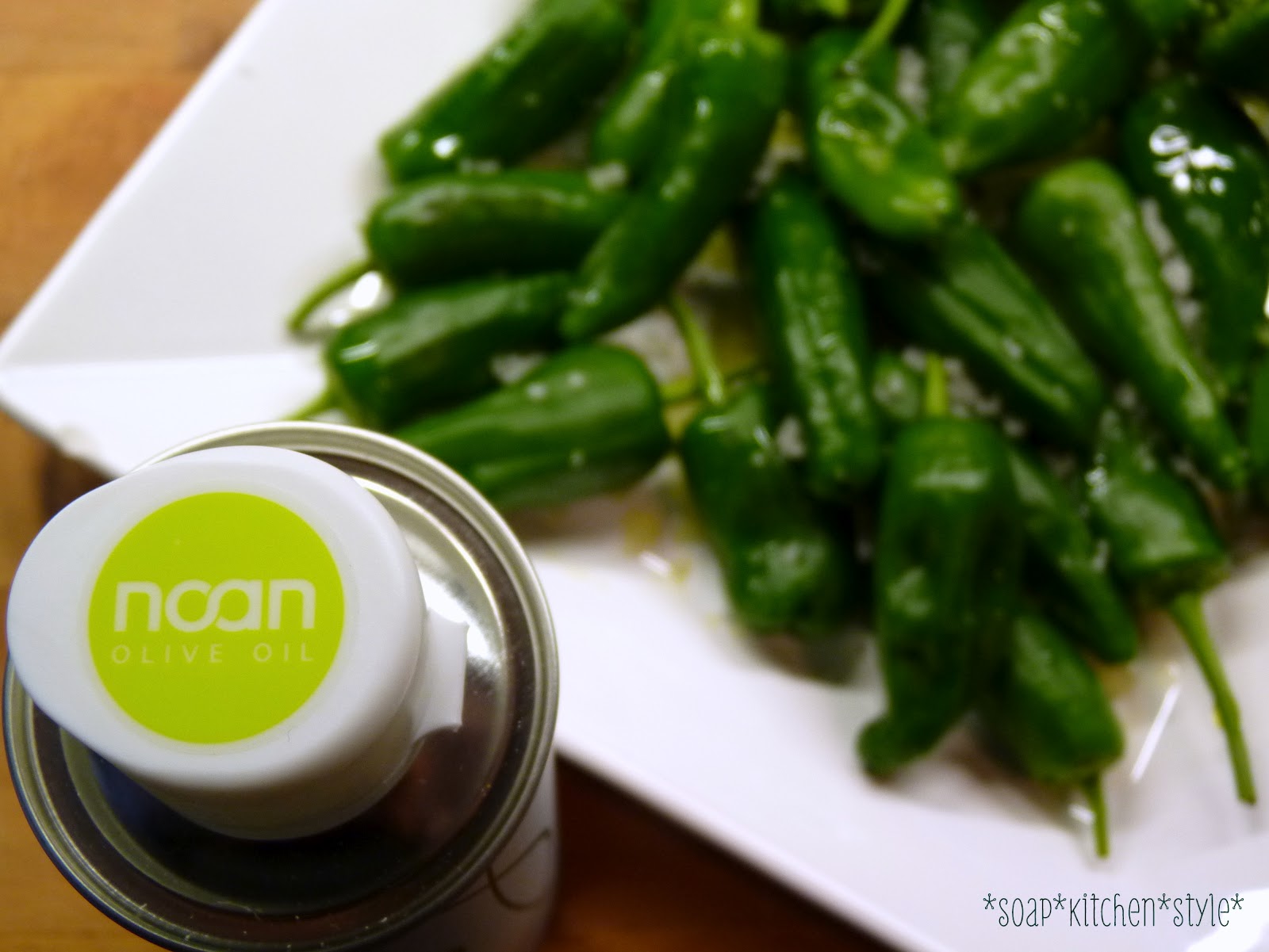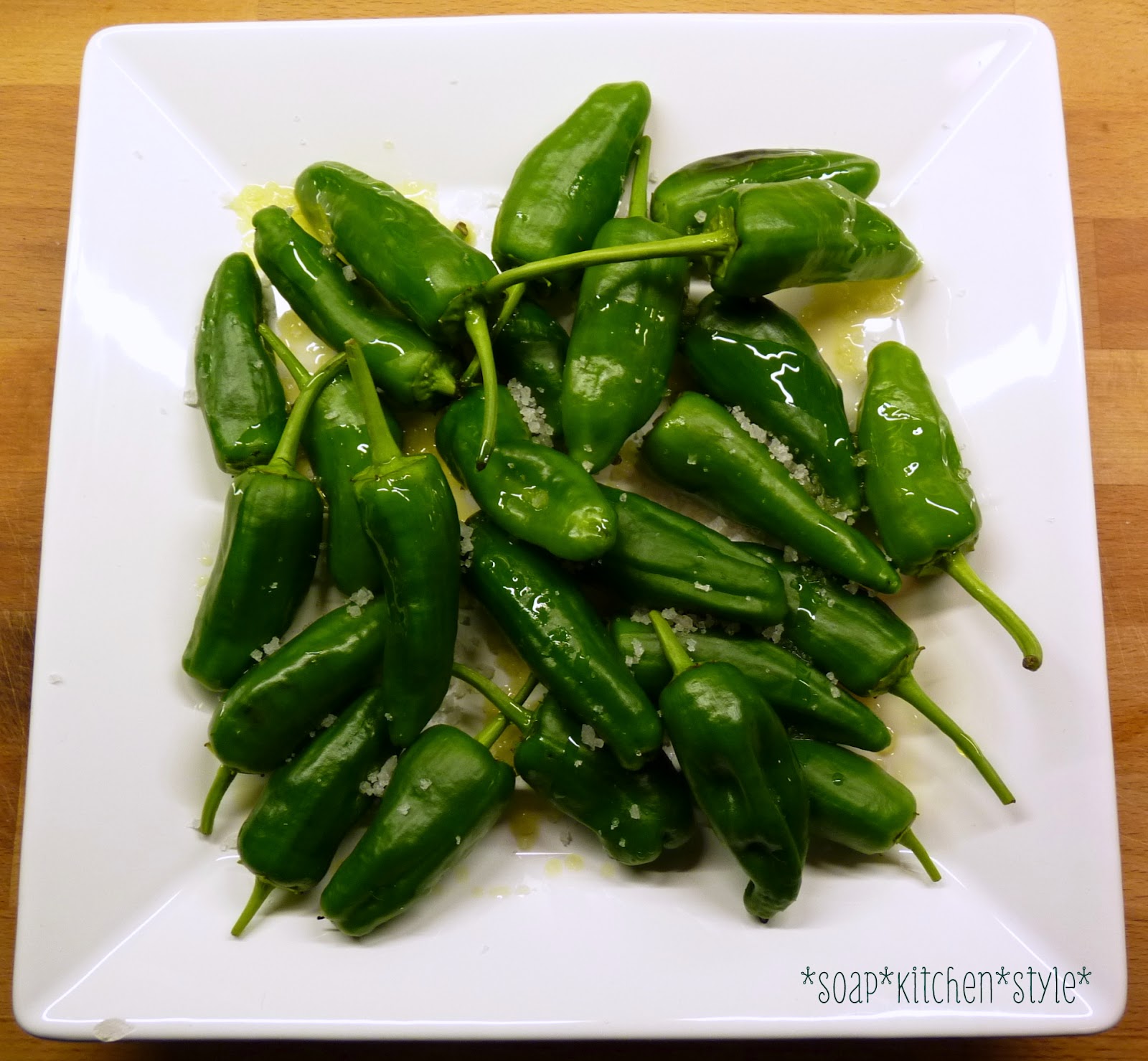Pimentos habe ich bisher nur auswärts gegessen. als ich aber letzen Freitag bei Merkur frische Pimentos entdeckte, da wollte ich es wissen. Kann ja nicht so schwer sein! Also los, Pimentos mit Olivenöl beträufeln und mit etwas Meersalz würzen.